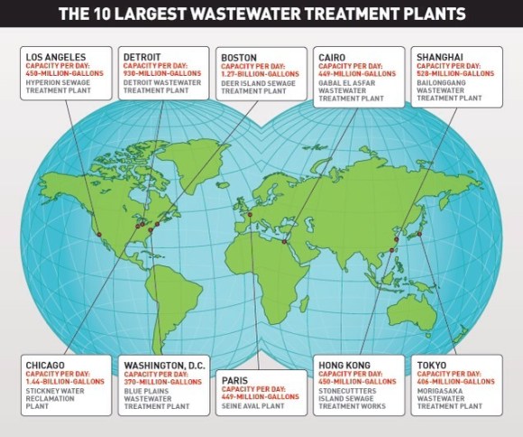 Deer Island Sewage Treatment Plant — Boston, USA. Capacity: 1.27 billion gallons per day. Owner: Massachusetts Water Resources Authority (MWRA). Driven by a federal court order in 1986 to end the discharge of 500 million gallons of poorly treated wastewater a year into Boston Harbor, the MWRA launched an 11-year, $3.6 billion program to upgrade treatment for the greater Boston area. ICF Kaiser Engineers provided construction management. Three pump stations bring the influent, which flows through grit chambers and then is routed to 48 primary treatment clarifiers. Secondary treatment is accomplished using both gravity treatment and an oxygen-activated sludge system, handled by twelve 140-ft tall, 90-ft dia egg-shaped sewage sludge digesters, the largest digesters in North America at that time. The methane produced by digestion is fed to a generator, producing 3MW of electricity. The sludge is dried further and processed into fertilizer pellets. 75 tons per day of the pellets are produced, and sold to blenders of agricultural fertilizers, landscapers, and golf courses. Following primary and secondary treatment, the wastewater undergoes disinfection to kill bacteria, first mixing it with sodium hypochlorite, followed by adding sodium bisulfite to dechlorinate the water so that the discharge will not threaten marine organisms. The plant includes both a five-mile-long, 14-ft dia underwater tunnel bringing influent from the Nut Island primary treatment plant, and a 9.5-mile long, 24-ft dia outfall tunnel to deposit the treated effluent into Massachusetts Bay. The plant handles sewage from 2.5 million people in 43 communities in the greater Boston area.