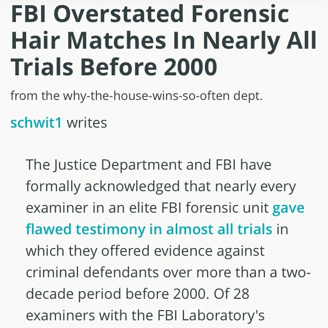 Categories Current Events FBI Overstated Forensic Hair Matches In Nearly All Trials Before 2000 Post author By danelabonte Post date 2015-04-19 (http://slashdot.org/story/268735) ← May flowers → Multifamily Embraces Modular Construction
