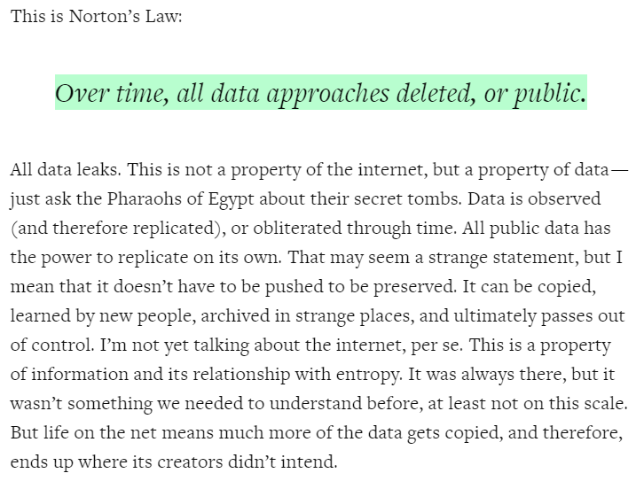 Categories Tech Norton’s Law Post author By danelabonte Post date 2015-08-31 “Over time, all data approaches deleted, or public” (https://medium.com/message/hello-future-pastebin-readers-39d9b4eb935f) ← Kansas statistician suing the state to obtain election records, says voting results don’t add up → Atlanta-Area Cop ‘Likely’ Shot by Fellow Officer After Entering Wrong Home