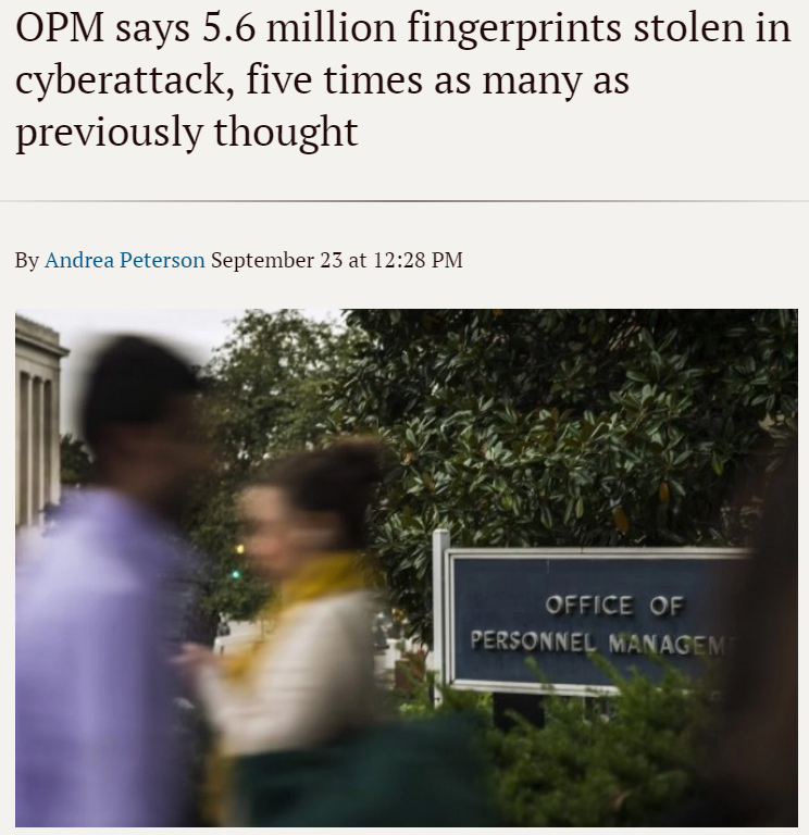 Categories Current Events 5.6 million fingerprints stolen from OPM, 5 times more than previously thought Post author By danelabonte Post date 2015-09-23 Still includes the Social Security numbers and addresses of more than 21 million former and current government employees. (https://www.washingtonpost.com/news/the-switch/wp/2015/09/23/opm-now-says-more-than-five-million-fingerprints-compromised-in-breaches) ← British Isis member complains of ‘rude Arabs’ who steal his shoes, eat like children – and won’t queue → Sterling Animal Shelter and Worcester County Sheriff’s Department featured in PBS series ‘Shelter Me: Partners for Life’