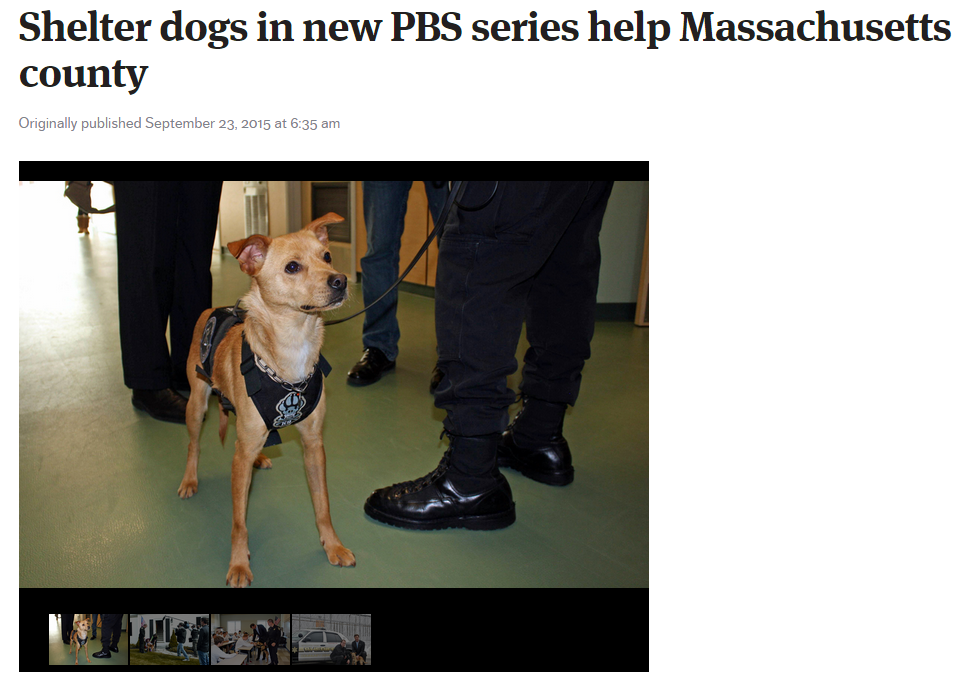 Categories Local Sterling Animal Shelter and Worcester County Sheriff’s Department featured in PBS series ‘Shelter Me: Partners for Life’ Post author By danelabonte Post date 2015-09-23 (http://www.seattletimes.com/nation-world/shelter-dogs-in-new-pbs-series-help-massachusetts-county) ← 5.6 million fingerprints stolen from OPM, 5 times more than previously thought → Fidgeting may help offset the negative health effects of sitting for hours