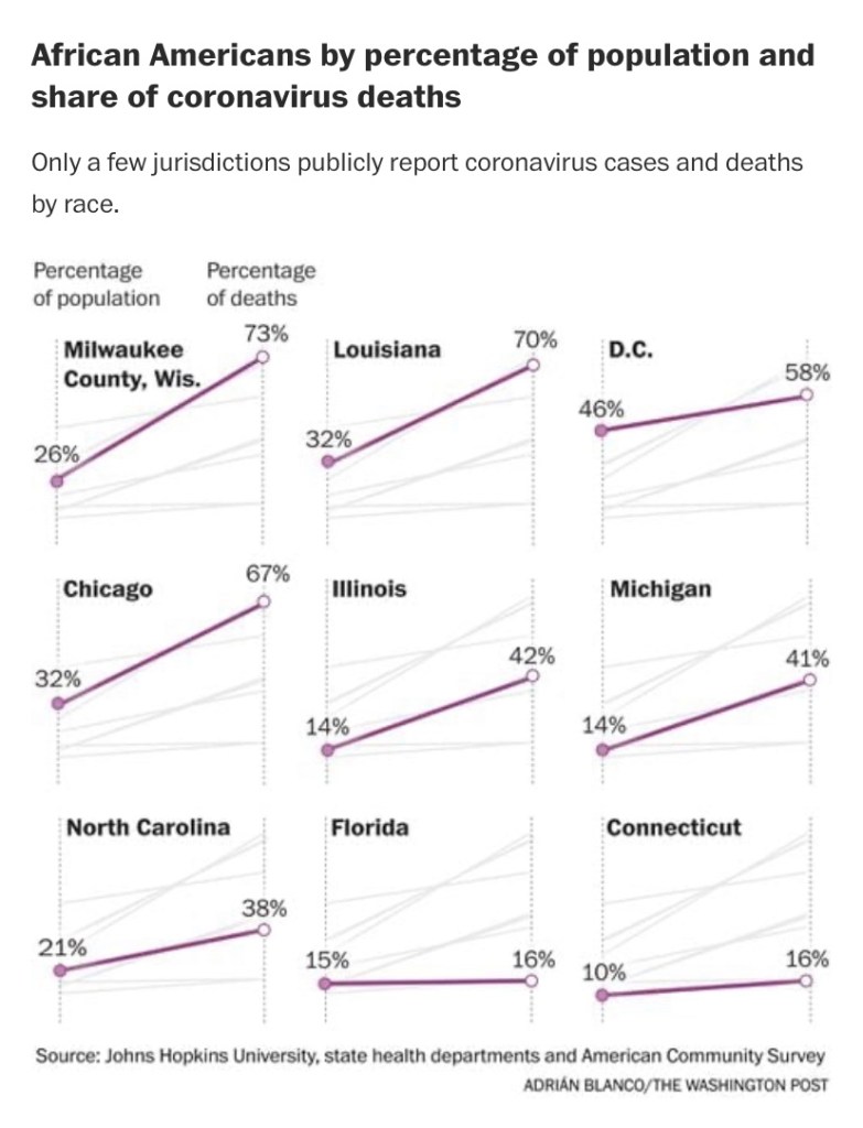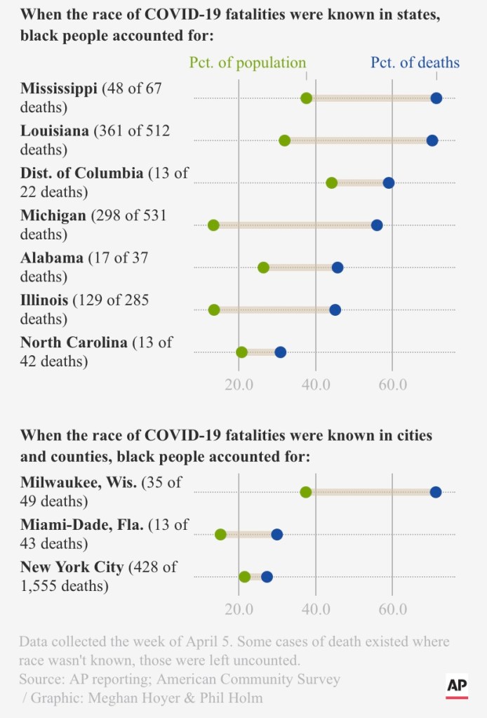 “Of the victims whose demographic data was publicly shared by officials — nearly 3,300 of the nation’s 13,000 deaths thus far — about 42% were black, according to an Associated Press analysis. African Americans account for roughly 21% of the total population in the areas covered by the analysis.”
