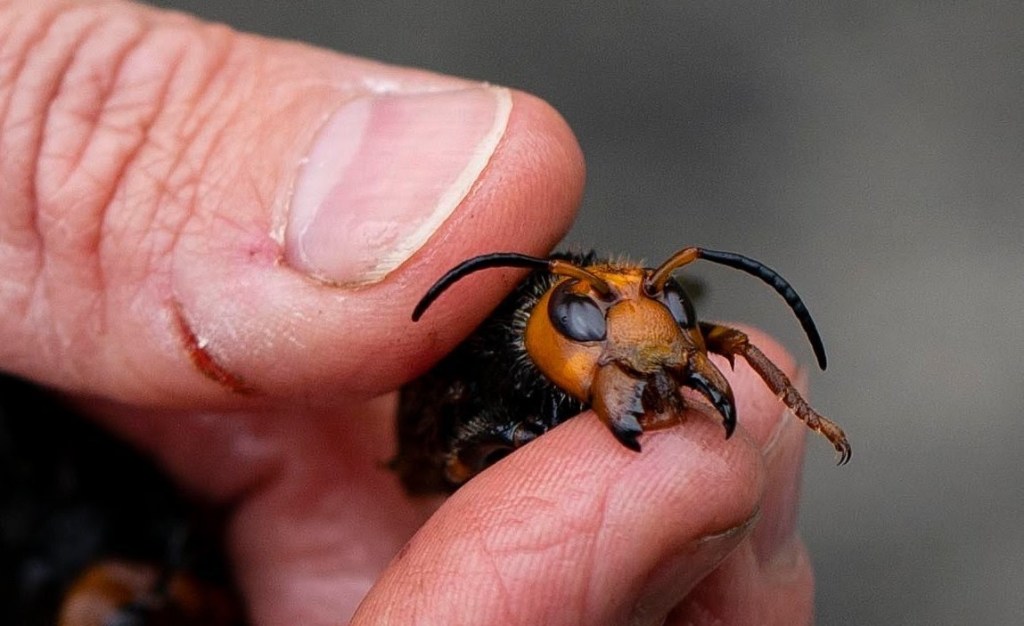 “With queens that can grow to two inches long, Asian giant hornets can use mandibles shaped like spiked shark fins to wipe out a honeybee hive in a matter of hours, decapitating the bees and flying away with the thoraxes to feed their young.