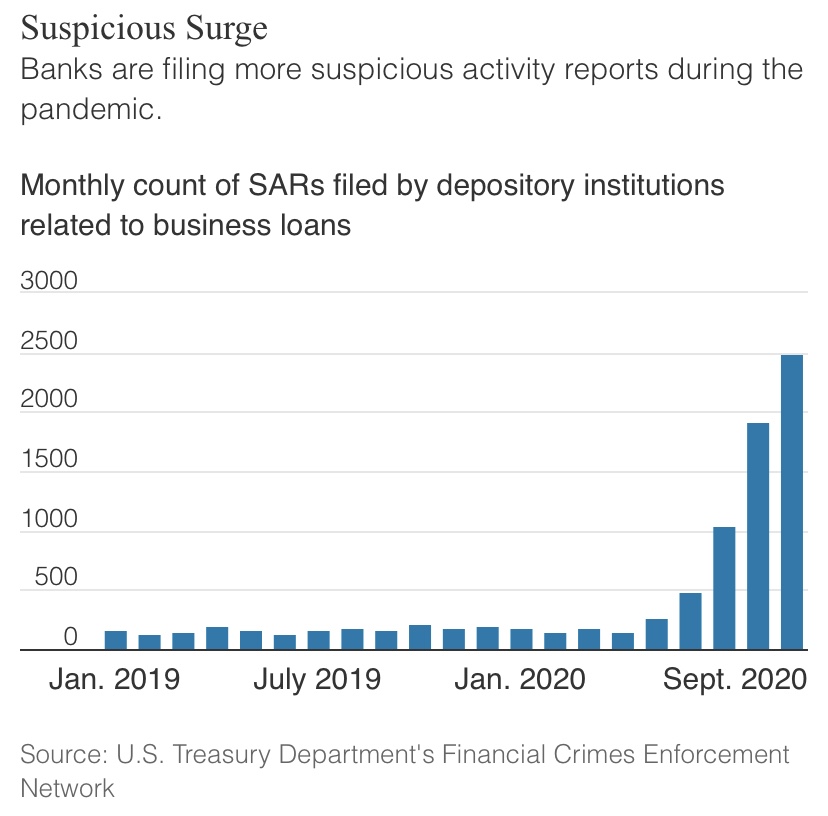 “The Treasury Department in September received 2,495 suspicious activity-reports involving business loans from banks and other depository institutions, more than the total for any year dating back to 2014.”