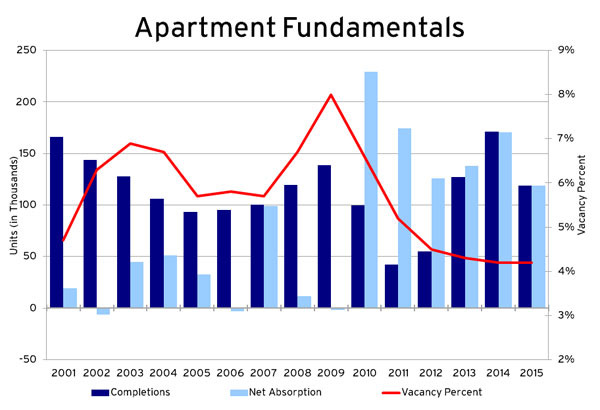 Apartment fundamentals have bounced back robustly since the recession ended in June 2009. Despite middling economic growth, the national vacancy rate dropped sharply from a peak of 8.0 percent at the end of 2009 to 4.6 percent in the third quarter of 2012. Vacancy rates that are this low have not been observed since late 2001.