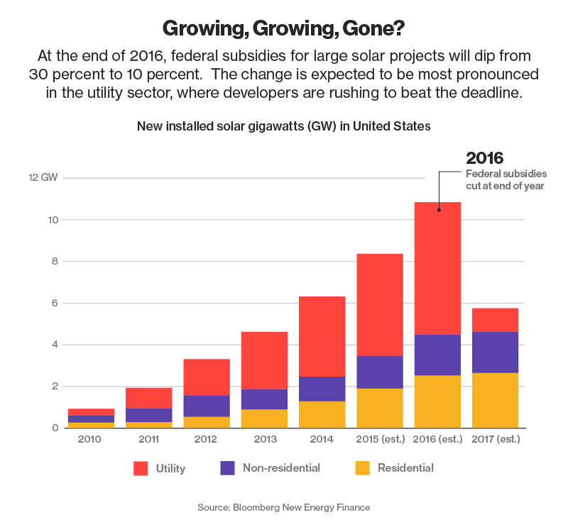 At the end of 2016, federal subsidies for large solar projects will dip from 30% to 10%