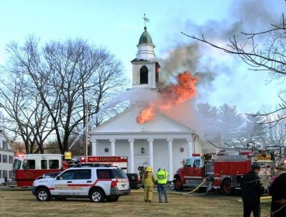 Firefighters tried to extinguish a fire at the First Congregational Church of Pomfret before it blazed out of control. The church was founded in 1715. The fire leveled the church; reportedly all that was saved was a cross and a flag.